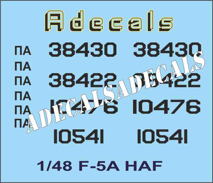 Οι χαλκομανίες μας ADECALS είναι όλες εκτυπωμένες σε πολύ καλής ποιότητας WATERSLIDE DECAL σε λέιζερ εκτυπωτή . Αριθμοί και γράμματα τυπώνονται πάνω σε διάφανο και εθνόσημα σε λευκό WATERSLIDE DECAL .